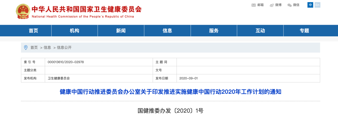 9月1日,健康中國(guó)行動(dòng)推進(jìn)委員會(huì)辦公室發(fā)布《推進(jìn)實(shí)施健康中國(guó)行動(dòng)2020年工作計(jì)劃》(以下簡(jiǎn)稱《計(jì)劃》)。
